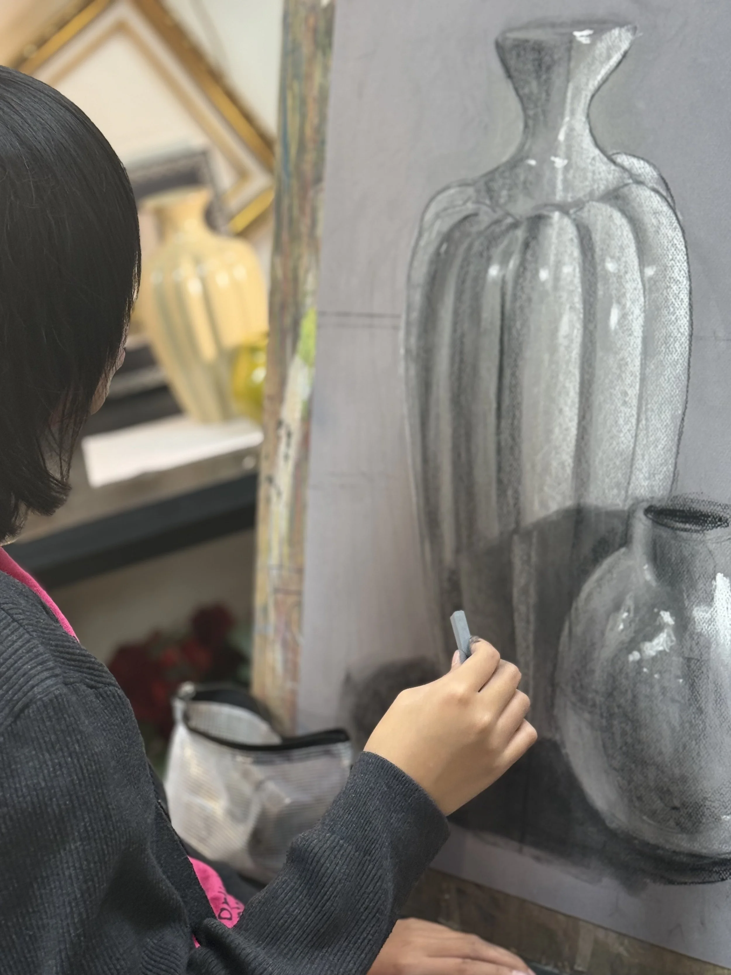 Within our vibrant studio, sketchbooks become dynamic spaces where expressive mark-making, purposeful practice exercises, enriching vocabulary, and captivating technique studies converge. Enhanced by a variety of materials, each sketchbook evolves into a compelling visual chronicle, capturing a student’s artistic growth and creative exploration over time.